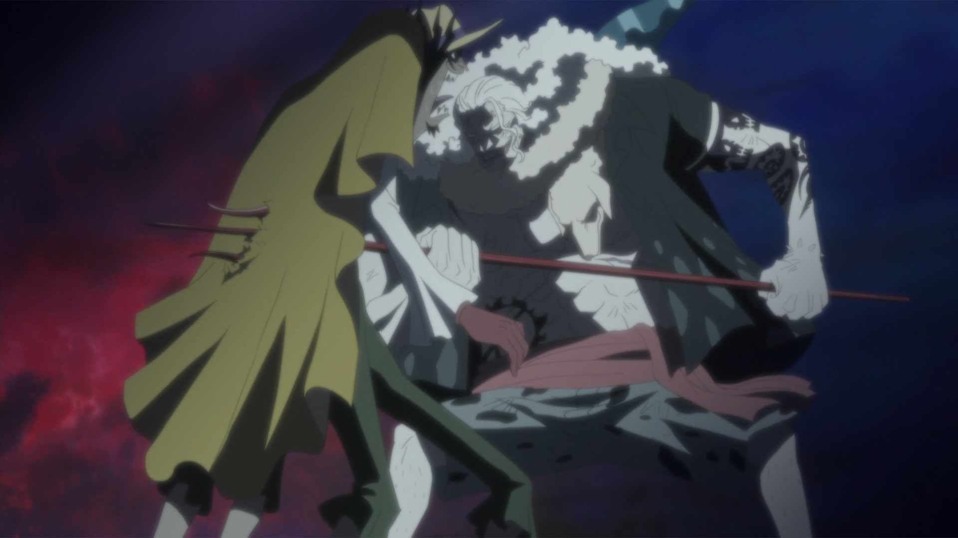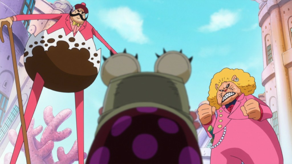 This leads to some fun lore drops as we find out one of the ancient weapons is located at Fishman Island, hear more vague Joy Boy references, hear that Akainu has become the new Fleet Admiral after defeating Aokiji, who then left the Marines entirely, and that Blackbeard has taken over most of Whitebeard’s old territories and his place in the Four Emperors of the Sea. We also see Caribou, who yes this whole time had been sneaking around trying to capture mermaids and steal treasure, get his arse kicked again and that Hody and his group have succumbed to the negative effects of the Steroids and become old and enfeebled. Just before the Straw Hats head out we also get a few episodes where two members of the Big Mom pirates arrive for the Island’s monthly payment of sweets only to find out that due to the damage done by Hody’s crew they can’t meet their quota.