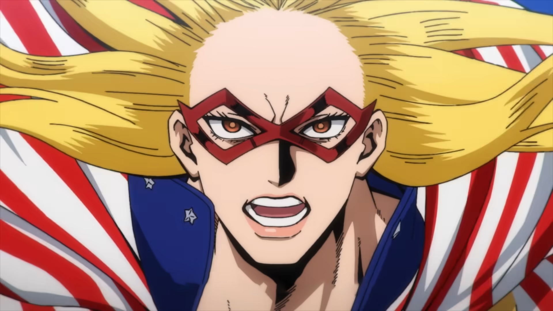 The first mini-arc, “The Star and Stripe arc” takes place over two episodes as the titular Star and Stripe, America’s number one hero, travels to Japan to help after Tomura Shigaraki and All For One decimated the country’s hero population and brought citizen’s morale to an all-time low. Star and Stripe was inspired by All Might and has the Quirk “New Order” which allows her to basically make up whatever rule she wants to on up to two things she’s touched, though normally she always has a rule on herself to make her stronger and more resilient. Her arrival though is exactly what All For One wanted as adding her Quirk to his list along with Tomura as a new body would make him literally invincible, so he confronts her across the ocean within Shigaraki’s body. The two have a very weird fight with their respective powers, especially Star and Stripe, who does things like give a new rule to the air around her opponent that basically tells it to vacate the area around him, or then turning that air into a giant avatar of herself to smack “Shigaraki” about the place and then gets her US comrades to drop a massive bomb on him.