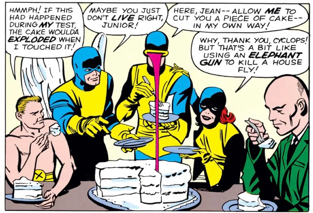 Aww, they’re all so happy… and dressed so poorly. Never liked the original X-Men outfits!