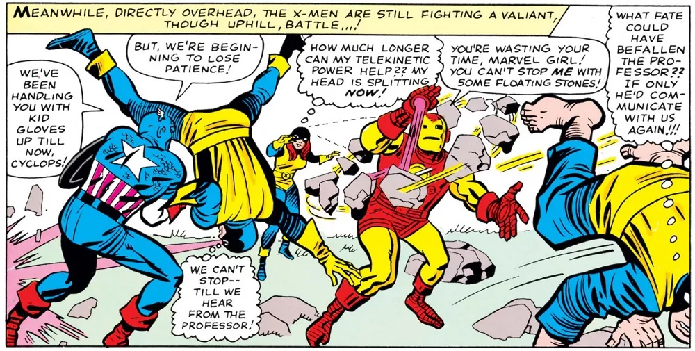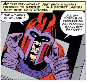 Magneto makes his debut! Funny how his basic design never changed, just his cheesy villain dialogue was replaced with Nazi survivor’s guilt… Hooray? (Well, yeah, it does make him a far more interesting character later on! … Did I just talk to myself via brackets? Oh well…)