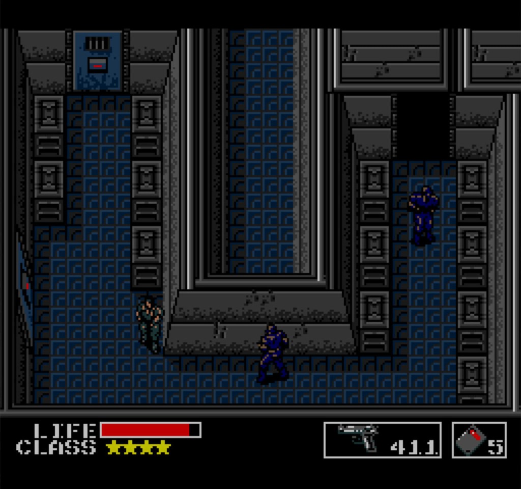 The game takes a top-down 2D perspective segmented into loads of small square screens (think the original Legend of Zelda) where you control Solid Snake as he infiltrates the military base known as Outer Heaven. While you can pick up a gun and start shooting the enemy officers this isn’t a good idea because as mentioned this game pioneered the idea of stealth. If make a loud noise, get spotted by a camera, trip an inferred alarm switch etc. then an alarm rings out and soldiers start pouring into your location and you either have to kill all of the enemies or escape outside of the entire building or head into a lift. The only exception to this is if you’re only spotted by a regular enemy on a normal screen, then all you have to do is move to the next screen and you’re fine. There are ways to deal with enemies quietly though, you can sneak up behind them and punch them until they, um, vanish or shoot them with a silenced pistol, though the suppressor item does have a meter that wears out so you don’t over-use it. Basically the best course of action is to just avoid combat and sneak around guards and underneath cameras as much as possible.