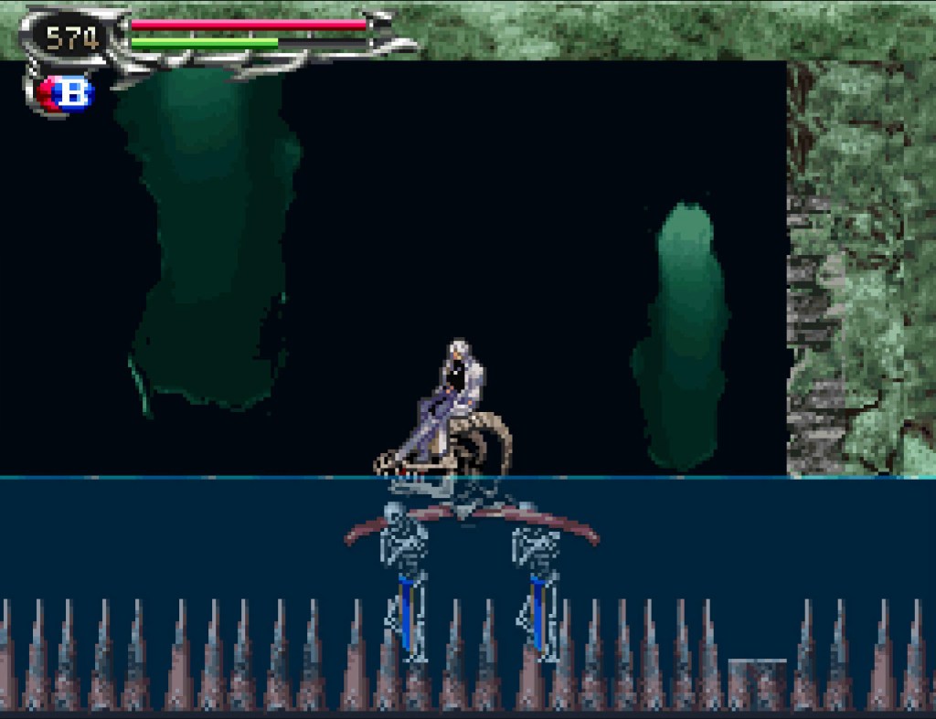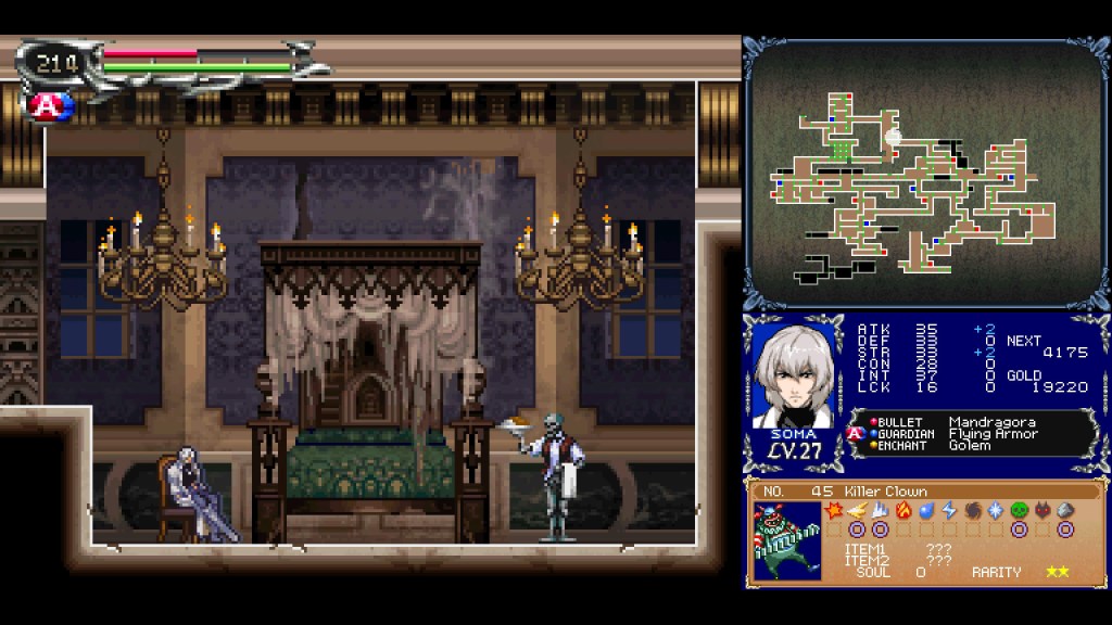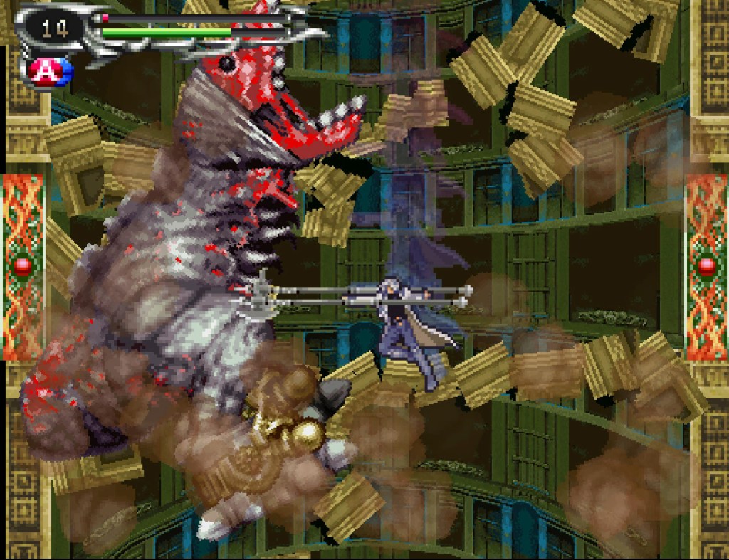 At its core it’s still very much an “action platformer” and obviously a “Metroidvania” to boot. You slowly uncover a map while attacking enemies and platforming, keeping an eye on your health bar and magic gauge, gaining access to areas previously unavailable by gaining new abilities and defeating bosses. You have stats that will level up as you gain experience or go up depending on the equipment you have, well, equipped and you can buy new equipment and health restoring items from a shop. It’s always a very satisfying formula and done very well here, as you’d imagine after so many great ones before it. Your methods of attack are with weapons, which can change from swords to whips to spears to even handguns, and all have a special move that take a little off of your magic when you do it. There are also special abilities once again gained by absorbing the souls of defeated enemies, with some souls being rarer than others. The “gotta collect ‘em all!” part of the “Tactical Soul” system was a major highlight of Aria and I was happy to see it back.
