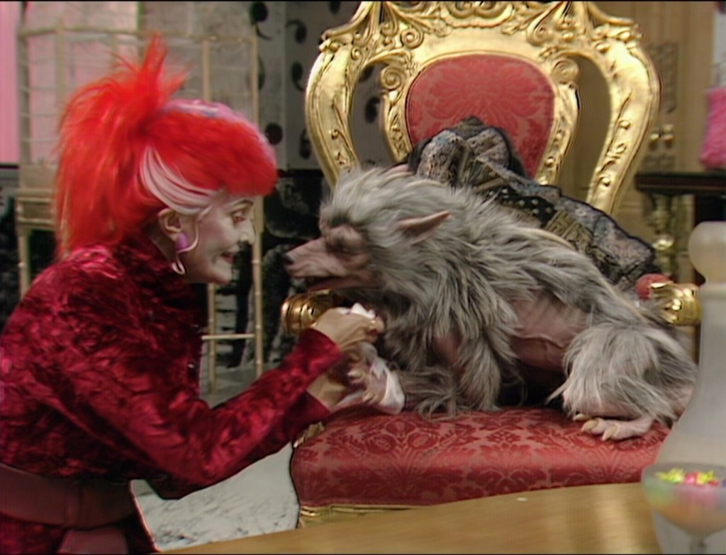 The story is set on the planet “Terra Alpha” and sees The Doctor (Sylvester McCoy) and Ace (Sophie Aldred) arrive as the people of the planet are dominated by a regime that has outlawed unhappiness to the point where anyone caught being unhappy is executed by the titular Happiness Patrol (who for the record also paint the TARDIS bright pink because it otherwise look depressing, which is at odds with the whole depressing aesthetic of the sets, but whatever…) The planet is led by Helen A (Sheila Hancock), a rather on-the-nose parody of Margaret Thatcher, who while just before my time (I was a child during the latter days of her reign and therefore not interested in politics!) it only takes a second to discover how truly cold-hearted she was and let’s say controversial in her decisions, so it’s not hard to see where the writers were coming from even if this parody is obviously dialled up to eleven. She has a long-suffering husband in Joseph C (Ronald Fraser) and a pair of executioners in Gilbert M (Harold Innocent) and the infamous Kandy Man (David John Pope), who looks so close to the Liquorice All-Sorts mascot Bertie Basset that a lawsuit was threatened due to copyright breach. He’s a robot who takes great pleasure in making really sweet treats and watching as people die due to the side-effects… plus just pulling a lever and watching people get molten hot sugar poured on them. It’s a scary concept and the costume isn’t even that bad, but the weird modulated voice and constant use of 60s Batman-level puns takes the edge off, sadly…