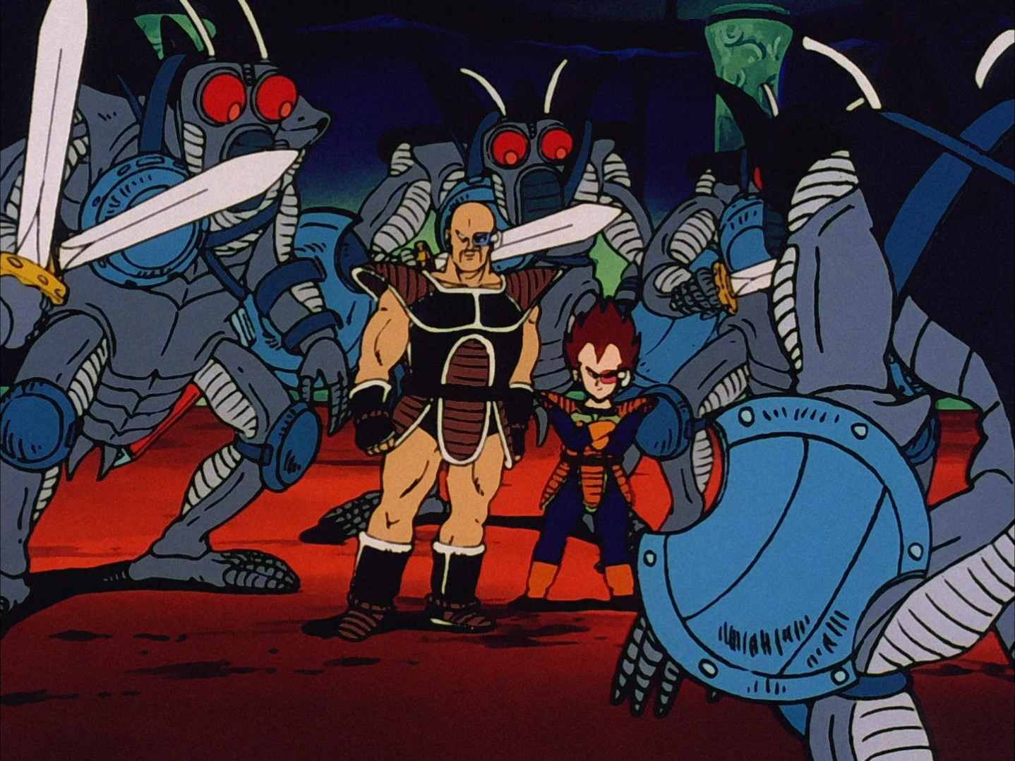 Vegeta and Nappa are surrounded by the Arlians… Also: the first and only appearance of Vegeta’s green and orange armour and brown hair! Hooray!