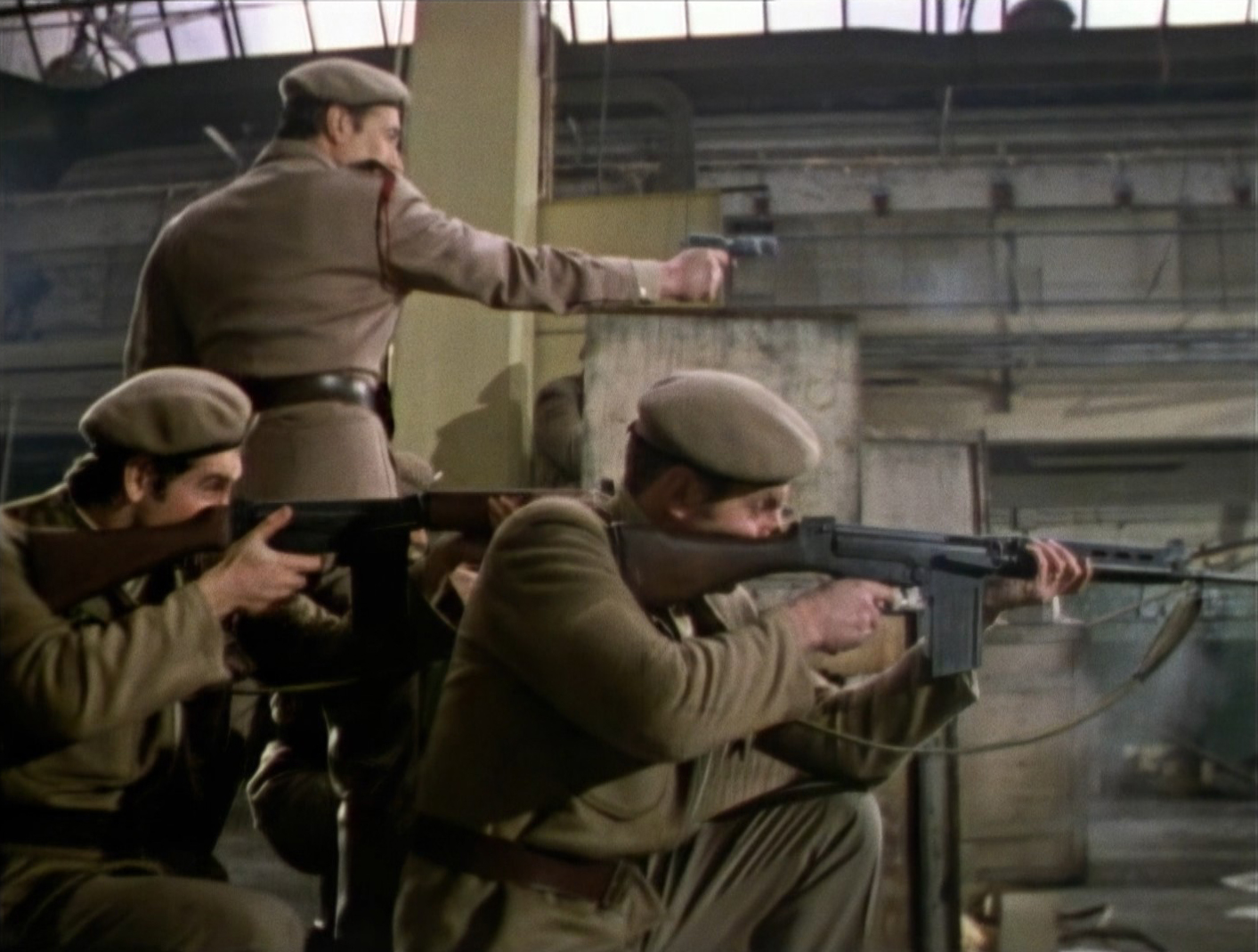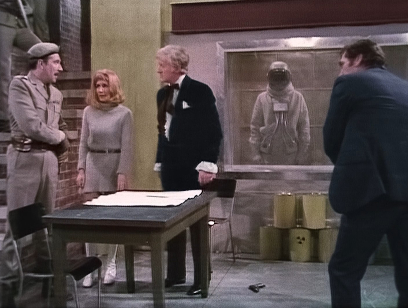 So by the end of the story The Doctor and Liz are locked up under guard by Reegan while Carrington has taken one of the Ambassadors to the Space Centre to do a public unveiling. Luckily The Doctor manages to get a morse code message that’s picked up by the fresh-faced returning Benton (John Levene), who is now a sergeant. The Brigadier and UNIT arrive (in Bessie as their own trucks and cars were confiscated) and rescue The Doctor and Liz by storming the building and shooting Reegan in the arm for good measure. The Doctor then talks to the two remaining Ambassadors and they agree to come with him and the Brig to the space centre to rescue their ally. This involves standing-off with some soldiers following Carrington and therefore “just doing their duty” having to be radiation blasted to death by the Ambassadors, though to be fair the Brig did give them a chance to stand down beforehand.