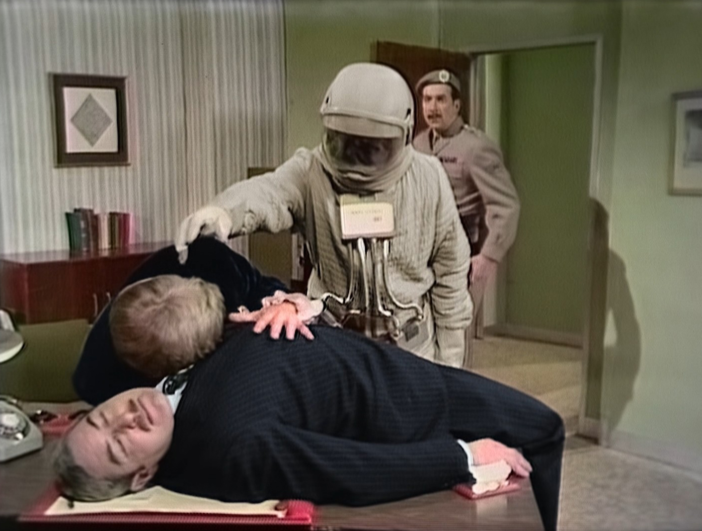 Carrington is moments away from creating a major panic by publicly revealing the Ambassador when The Doctor, Liz, The Brig and the two other Ambassadors arrive and although Carrington tries to convince people of the “alien threat” he gives in, claiming he was just doing his “moral duty” as he is escorted off the premises. The Doctor leaves all the clearing up (including getting the human astronauts back down) to Liz as he… can’t be arsed I guess, but gets a good final gag in by going to shake one of the Ambassadors hands before thinking better of it…