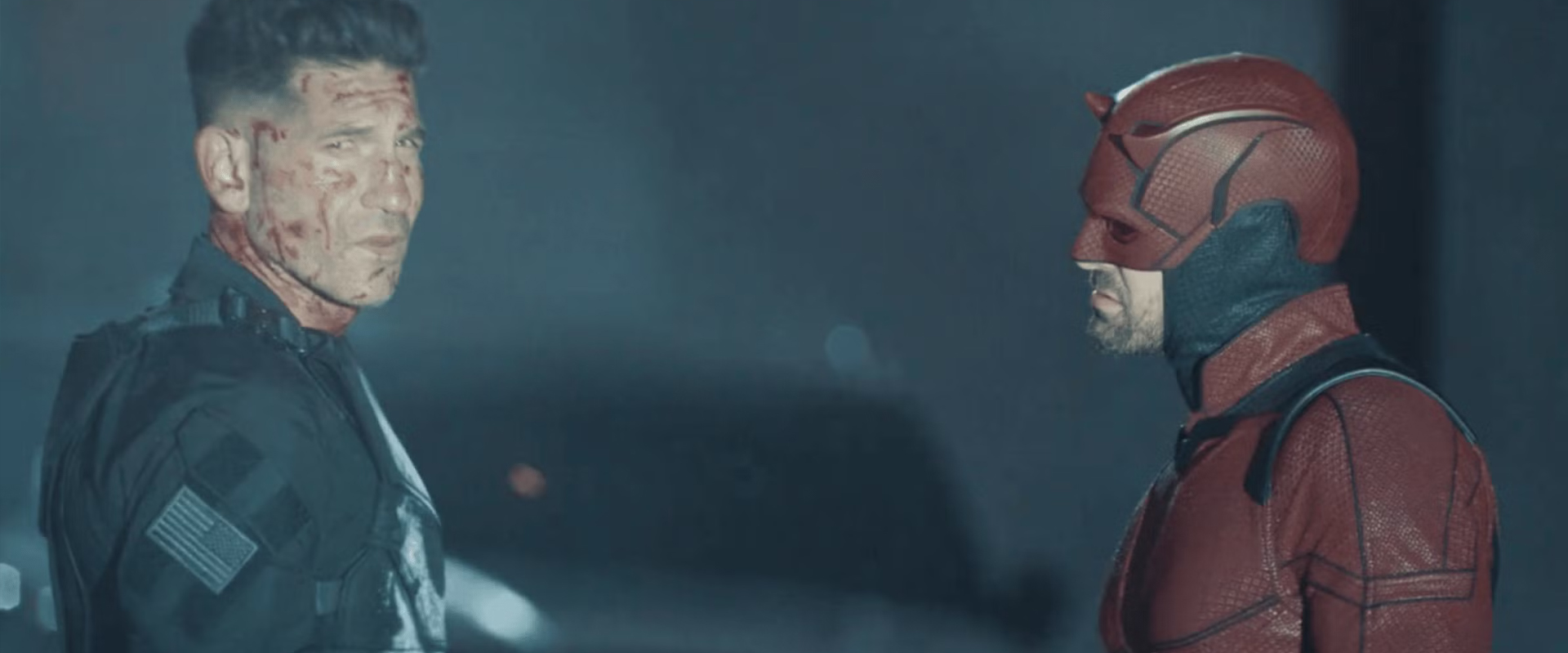 The first half-ish of the show basically shows us how Matt gets pulled back into the game and suits up again. He represents a superhero called White Tiger (Kamar de los Reyes) after he accidentally kills a dirty undercover cop in a fight and despite being labelled a “cop killer” Matt manages to pull it off… only for Tiger to get shot in a head shortly afterwards by a cop wearing Punisher gear. This leads to the triumphant return of Jon Bernthal as Frank Castle / The Punisher as Matt confronts him about it, but Frank says its just “fan boys” and not him, before egging Matt on about the rage inside him and how Foggy’s death is haunting him the same way his family’s death also motivates him, but he leaves Frank behind in a huff, most likely because he knew he was right. After a fun but strange “bottle episode” where Matt stops a violent bank robbery (which includes Mohan Kapur’s Yusuf Khan character from Ms. Marvel in one of the only non-Daredevil cameos in the show) The tone shifts a to be a bit more focused as a new villain called Muse (Hunter Doohan) appears, who drains his victims blood and uses it to pain murals. While Fisk creates his own group of cops with special privileges specifically to tackle vigilantes and dangerous criminals like Muse Matt finally suits back up when White Tiger’s niece ends up being captured by the criminal and he goes to save her, beating Muse up good but letting him escape as he saves her.