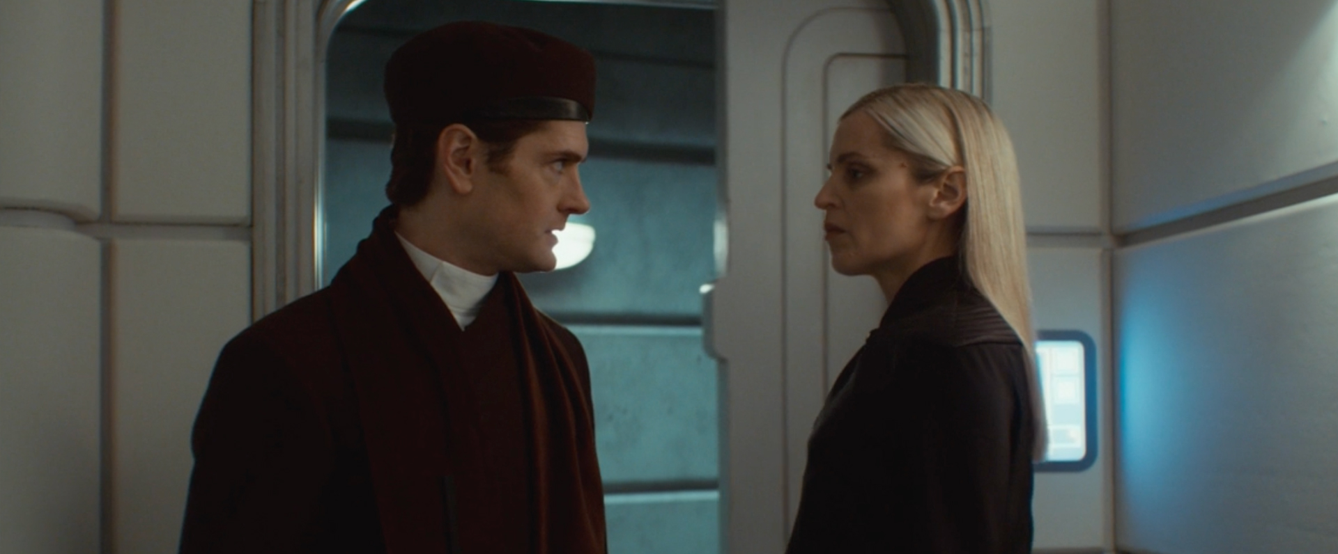 While all this is going on we check in on our Imperial characters. Syril (Kyle Soller) has now moved up from his tiny cubical to a management position and is dating Dedra (Denise Cough), who has found herself invited to a secret meeting chaired by Orson Krennic (Ben Mendelsohn), who reveals that for his “energy project” to move forward they need a rare crystal that exists underneath the surface of the planet Ghorman and they need an excuse to extract it. While the Empire plans a media campaign framing the Ghors as criminals and nuisances to the wider public Dedra says that the best way to do it would be to intentionally grow a rebellion on the planet so they’d have an excuse to more heavily occupy it, which Krennic likes. Great to see Mendelsohn back, he’s got such great sinister charm to him. Meanwhile Mon Mothma (Genevieve O’Reilly) is still struggling to balance her high societal social life and her privately funding of the growing rebellion when one of her co-conspirators starts to hurt financially and not-so-subtly asks for more money less he let things slip. Upon hearing this Luthen (Stellan Skarsgard), the cold-hearted rebel he is, has her old friend offed, much to Mon’s distress, leading to a now-infamous scene where she dances at her daughter’s wedding in something of a daze in order to not think about it.