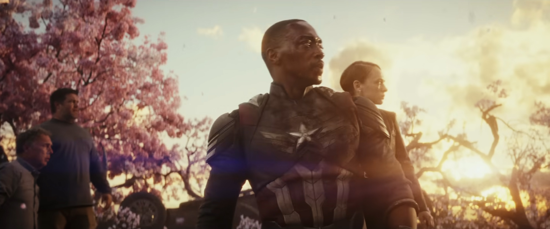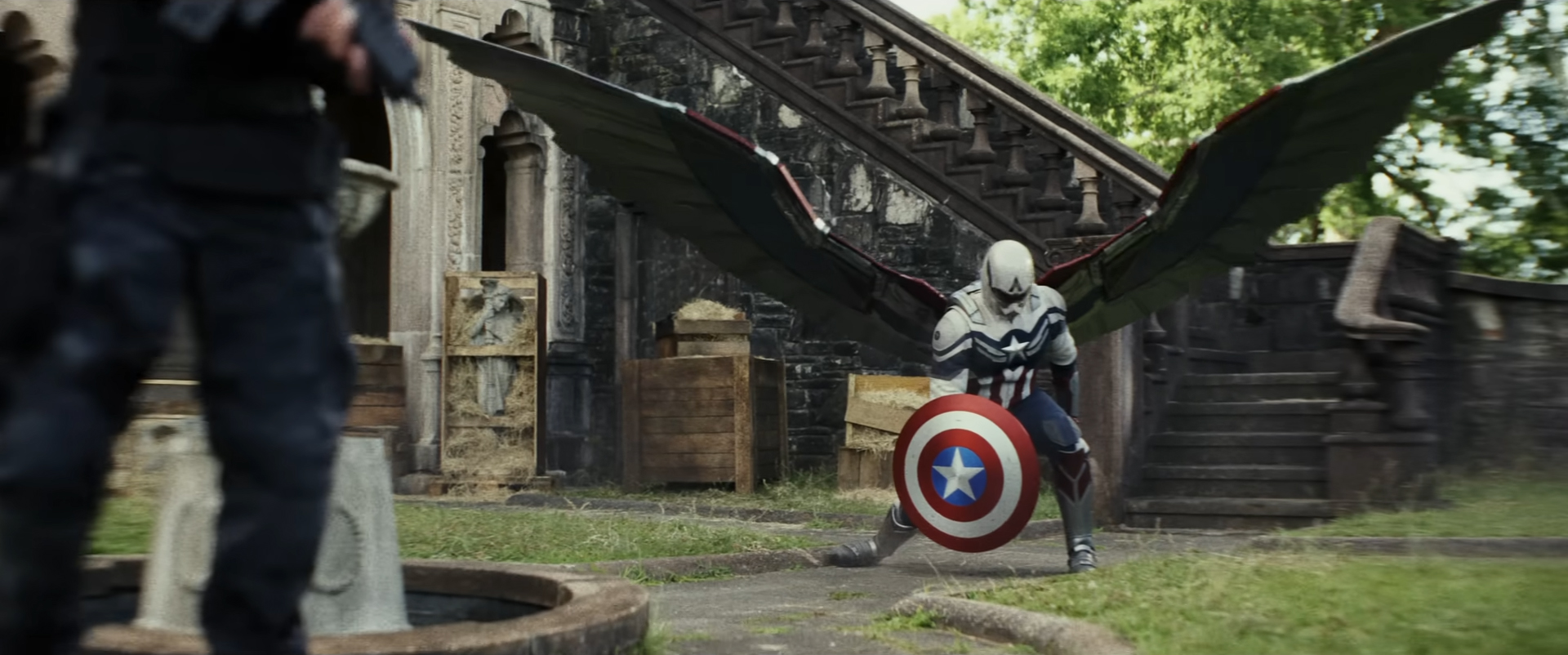 Cap arrives on the scene. Don’t worry, this is an MCU film, the mask vanishes almost immediately so the actor can show his face for the duration of the runtime. Just in case we forget what Anthony Mackie looks like!