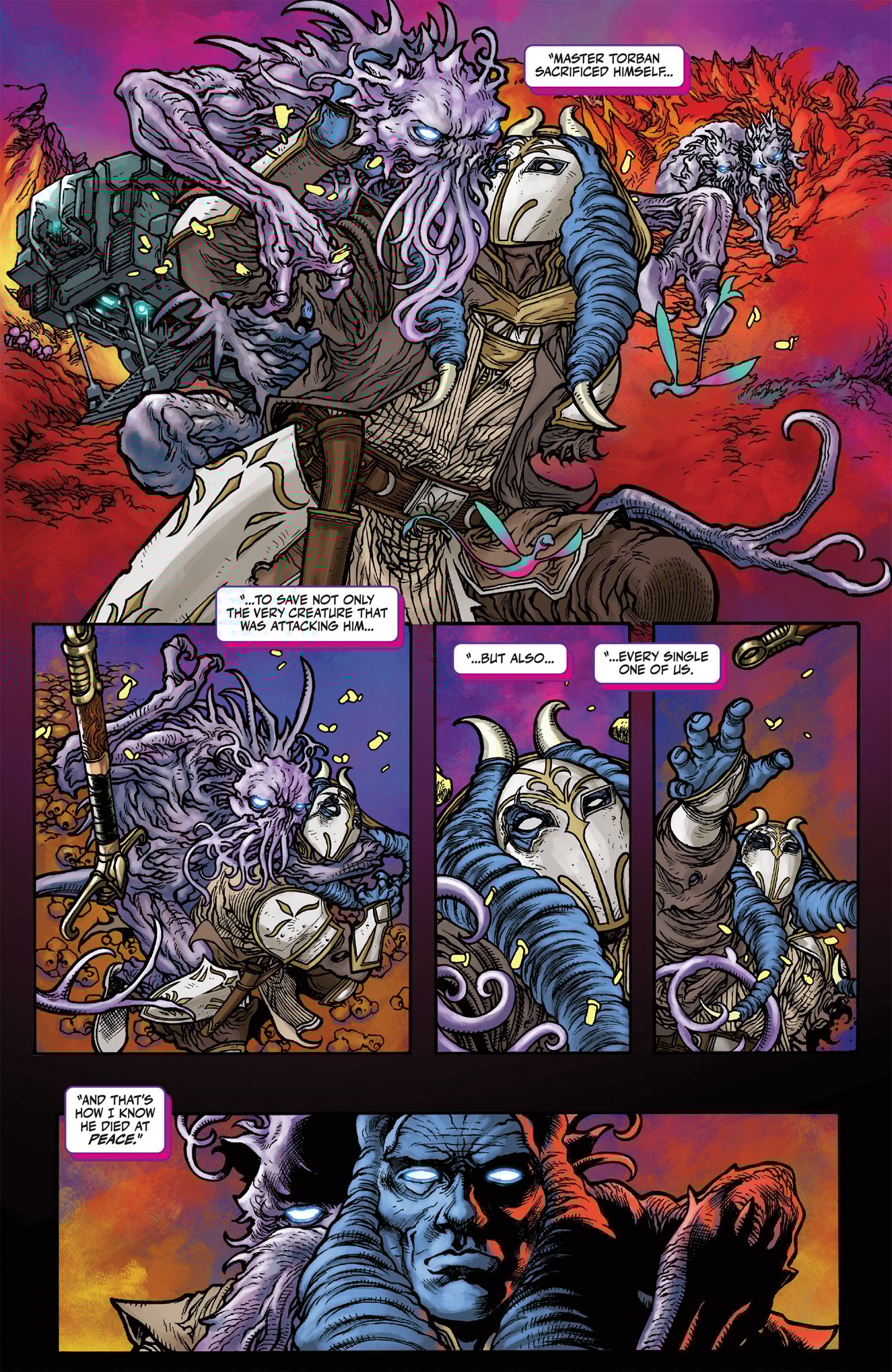 Burryaga and Bell, along with his Charhound Ember and the unconscious body of Terec, catch up with Marchion Ro, who first deals with and knocks Ember off of a cliff, leading to Burry leaping off the cliff and catching fire as he cradles the dog-like creature until they hit the lake below, suffering greatly. This leaves Bell to duel with Ro, who gets out the lightsabre of Loden Greatstorm, Bell’s old Master the first victim of the Nameless, to do it. The two fight and Ro gets the upper hand until Bell suddenly feels a massive surge in the Force and uses it to pick Ro up high into the air and drop him on some jagged rocks. Then with the help of Terec they lift Burry and Ember away from some ravenous creatures down below and then all of them collapse due to exhaustion. Finally Avar and Elzar find their way into a weird “vergence in the Force” that leads to a cave system / other dimension possibly that is half steeped in the Lightside of the Force and half in the Dark. There they meet some of the Nameless, but not emaciated and aggressive, but walking and talking intelligent creatures who drop some big lore dumps on us all. They are the Shrikarai, just like the old Jedi nursery rhyme claimed, and their planet is actually called “Sophros” and it plays a key part in maintaining balance in the not just the Force but the galaxy itself, and while some of them may die there are always eggs ready to hatch more of them to keep the balance going, but thanks to Ro stealing so many of their eggs and now killing them they have no means to keep balance and the Galaxy is doomed to succumb to the Blight.