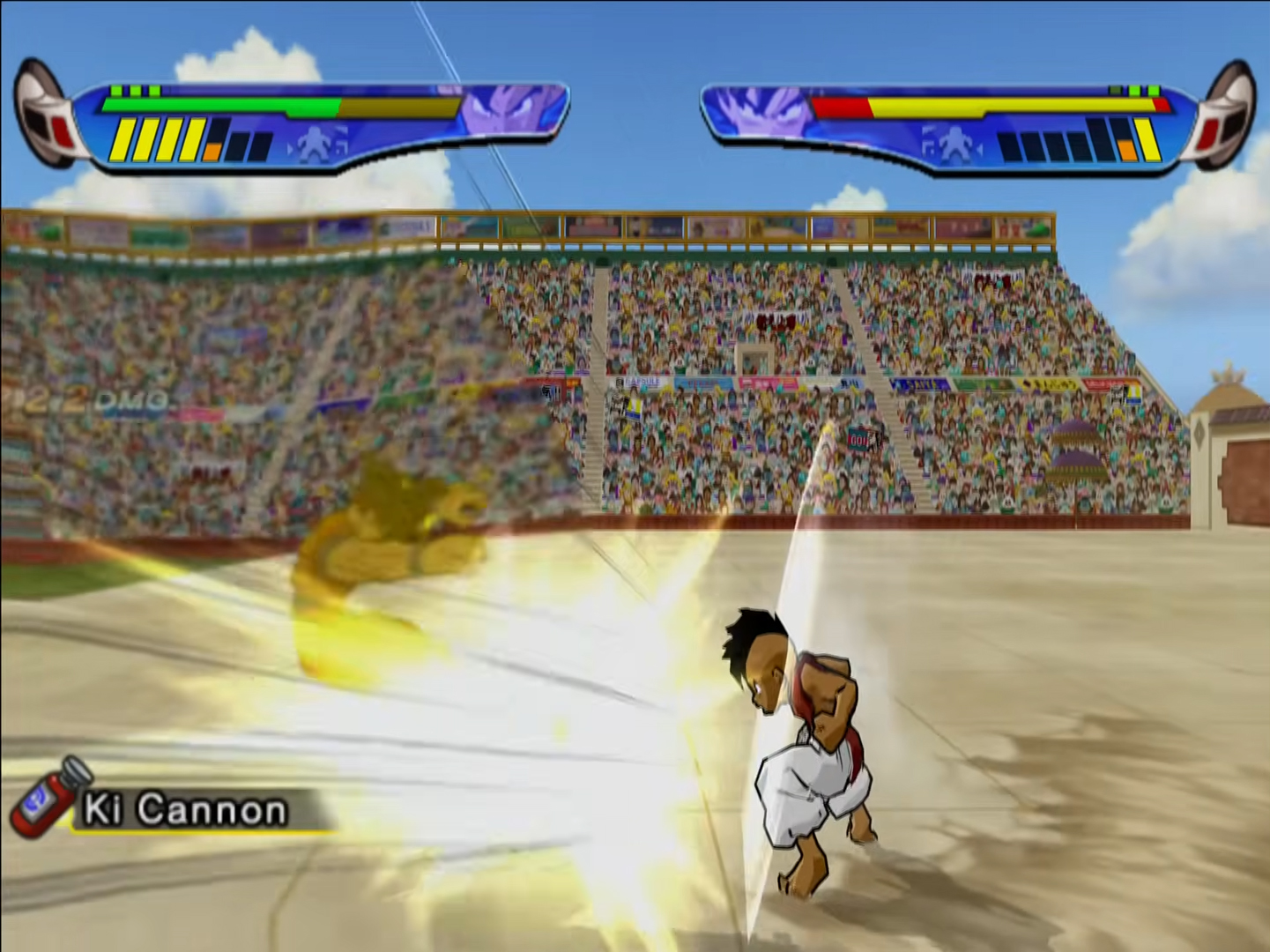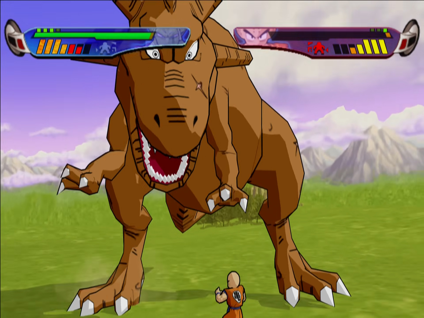 The core gameplay still has the same structure from the past two games in that it’s a 1 on 1 fighter that primarily uses the face buttons with a punch, kick, ki blast and block button assigned to each. Special moves are done by pressing a combination of the face buttons and sometimes a single direction push, and you can dodge left or right and fly into the air as well. The good thing about Budokai 3 is that they finally decided to add a bunch of new things to the gameplay system and improve others, like a constant nit-pick of mine has been how easy it is to lose a transformation because the Ki drops so quickly and once you take a strong hit with low ki you return to base form, but now every character has a set level of Ki and by transforming it ups the base level, plus transformations don’t drain Ki any more so while you still revert with a strong hit at low ki you’re less likely to be in that situation. It’s not perfect (and fusions are still a mini-game and a timer which this time will revert you back as soon as it runs out, so I rarely bothered with them…) but I’ll take it. You can now completely run out of Ki as well and become fatigued, forcing you to tap buttons to snap out of it as it leaves you vulnerable. They also added some little things like dodging an attack at the last second will do a teleporty dodge, which can also turn into the classic teleporting behind an opponent to attack (which they can do in turn, though not much more than that as it drains Ki…) plus they added a beam struggle mini-game when two beam attacks meet and both sides have to rotate their sticks and the person to fill up a bar first wins the encounter.