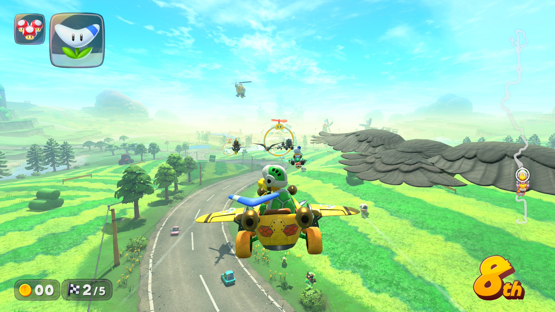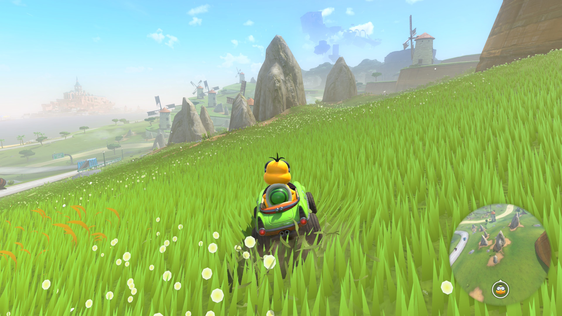 The big new single player mode is “Knockout Tour” and that’s at least a fun spin on things using the new open world as you race across the whole map and every checkpoint the person is last place is knocked out until one remains. I do enjoy it (despite forgetting to take a screenshot of it…) probably because it’s not reminding me of what the game isn’t and instead just makes it feel like a new interesting thing. The other well-advertised mode is “Free Roam”, where you’ll be surprised to find out is where you freely roam across the open world, collecting things and doing mini-challenges spread out across the map. It can be quite relaxing, especially given the great “radio” of remixed Mario songs playing, but it didn’t keep my interest for long.