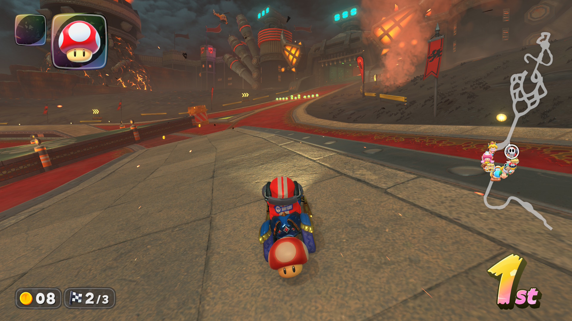 The classic Mushroom item on a Bowser’s Castle stage with a … Pit Crew Shyguy? Classic?