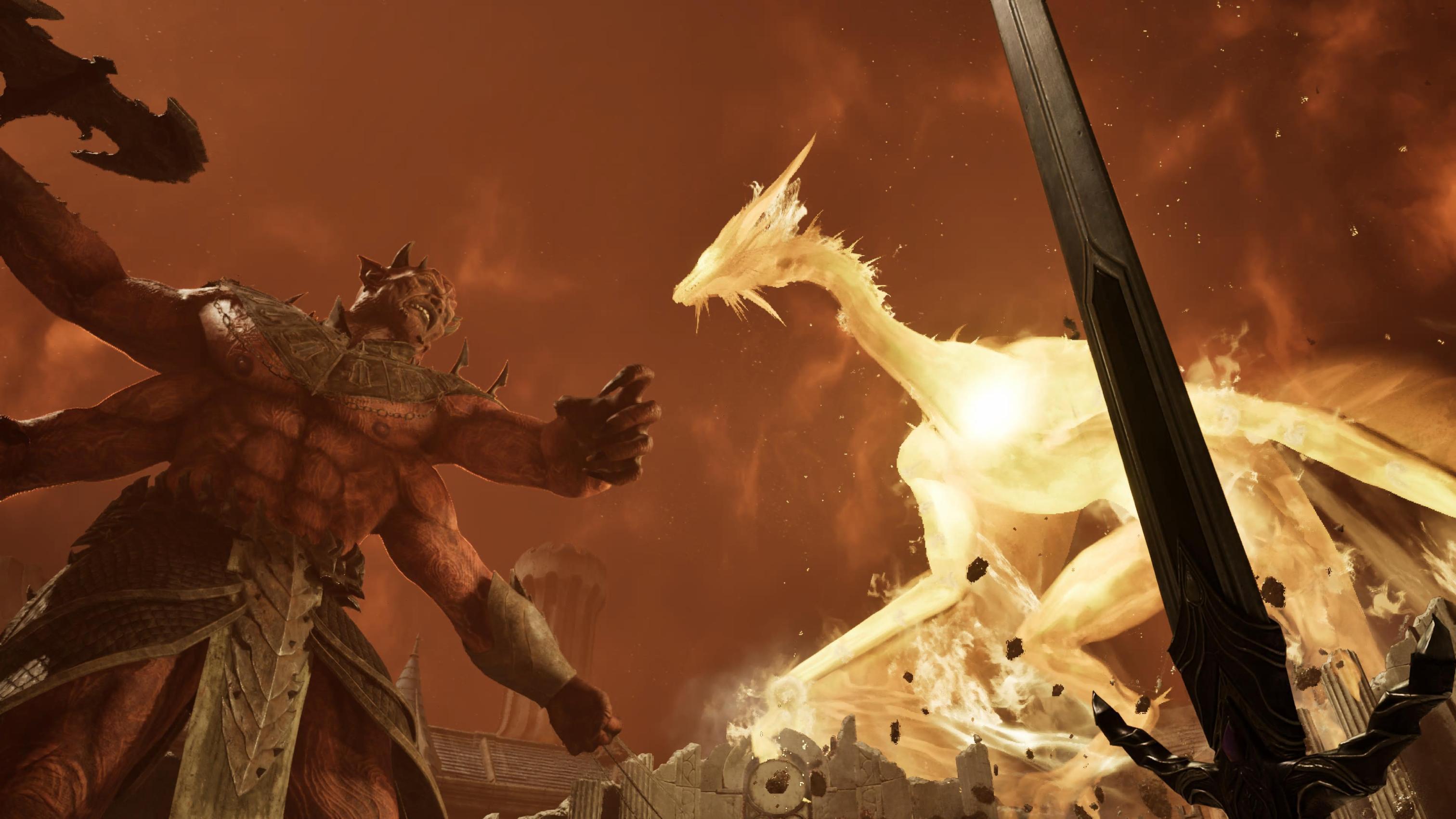 After lots of fetch quests and a great set piece where a “Great Gate” to Oblivion is opened outside of the town of Bruma and everyone chips in to help hold back the hordes while you get a Great Sigil Stone (so, yeah, it’s another fetch quest, but a great sequence to get there!) you enter Cameron’s personal realm of “Paradise” and slay him, retrieving the Amulet and Martin heads off to the Imperial City to get crowned King, only the city begins to be invaded by not only a massive army of Daedra but by Mehrunes Dagon itself as a massive towering figure. Seeing no other choice and using his knowledge of such things Martin intentionally breaks the Amulet and becomes one with the God that blessed it: Akatosh, the Dragon-God of Time. The two Godly avatars do battle and it ends with Dagon being sent back to Oblivion and all the gates closed for good. While the realm is now Kingless as the whole Royal Family has now been wiped out, at least there’s a realm at all…